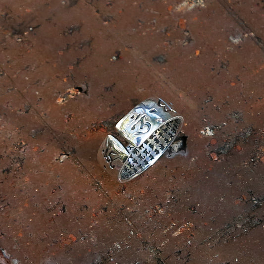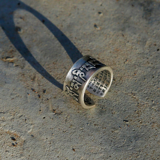 Vintage Style Tibetan Buddhist Prayers Adjustable Silver Ring, Buddhist Sutra Mens Ring (S)