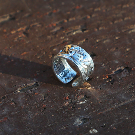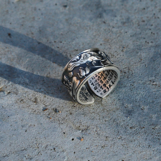 Vintage Style Embossed Lotus Adjustable Silver Ring, Buddhist Sutra Mens Ring (S)
