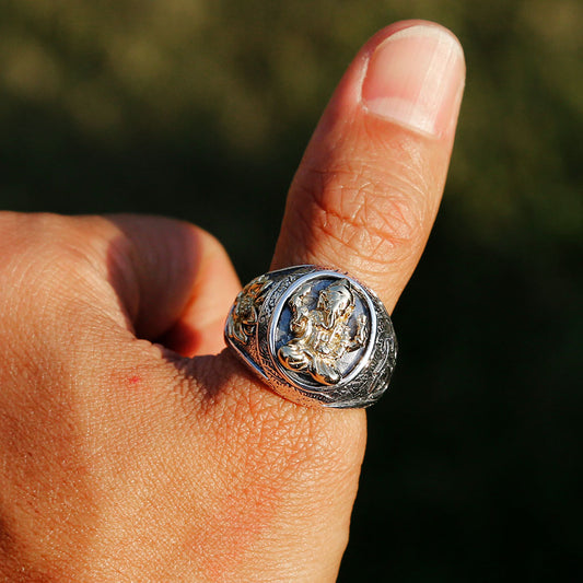 Lord Ganesha Buddhism Sterling Silver Mens Ring, India Buddhist Prayers Om Ring, Mens Meditation Ring (J)